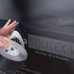 Zwarte all-round luchtdichtingskleefband voor binnen- en buitengebruik, uitermate geschikt voor het afkleven van naden bij wandbeschermingsfolies bij geventileerde gevels met open voegen.